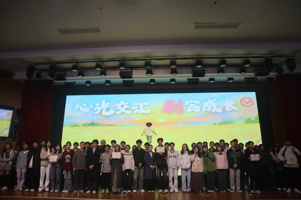 六支参赛队伍依次登台,用真挚的表演展现成长中的困惑与感悟。剧中情节引发阵阵掌声,现场观众全神贯注。中场穿插的“反向指令”和拼音首字母猜词游戏,更让同学们踊跃参与,或机智反应、或默契配合,欢笑声此起彼伏。大赛评选出各奖项并举行颁奖仪式,闫振振、孙博文为获奖队伍颁奖。全体演职人员与工作人员合影留念。