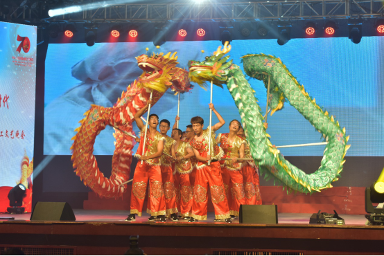 朔风动,战鼓起,随着大屏幕上毛主席慷慨激昂地说道:“中华人民共和国,中央人民政府,今天成立了!”自动化舞龙队携着两条威风堂堂的巨龙一个健步跃入舞台中央,把70年前祖国诞辰时那被巨大喜悦淹没的幸福感一下又带来到70年后的今天。只见舞龙队成员齐齐站定,双手的青筋一鼓,汹涌澎湃的力量便从大地经由成员们的底盘一路涌过腰部与手臂汇入到龙体内,由竹子扎成的布龙霎时被注入了灵魂,在灯与影的陪衬下腾云驾雾翻腾不息。